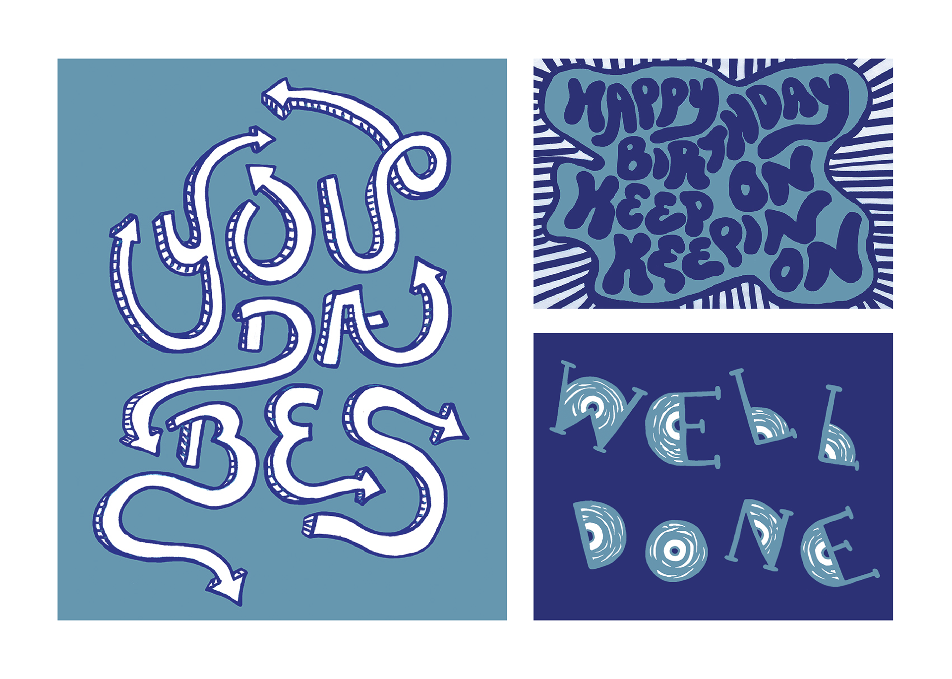 These cards were initially hand-drawn sketches that were later transferred to photoshop, where color was added. The type was inspired by a friend whose passions consist of graffiti art, records, and funk. The blue, white, and grey motif pays tribute to their favorite color combination. Incorporated into the type are elements of vinyl-era funk, as well as the ridges of the disc with classic styles of graffiti lettering.